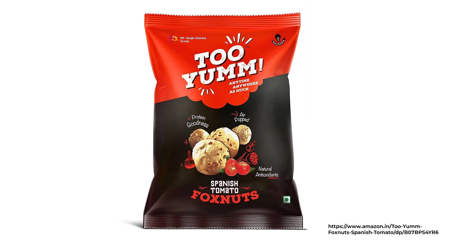 First up is Too Yumm Makhana from the RP-Sanjiv Goenka Group. This brand’s Makhana variants (Chatpata Masala Makhana, Tandoori Makhana, Spanish Tomato) come in colourful and cheerful packaging, mostly appealing to youngsters and fitness-conscious customers. It encourages them to indulge in healthy, tasty and guilt-free snacking.